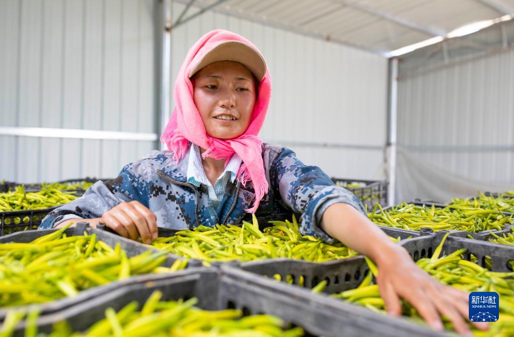村民在寧夏吳忠市紅寺堡區(qū)柳泉鄉(xiāng)柳泉村晾曬黃花菜(2020年7月7日攝)。新華社記者 楊植森 攝