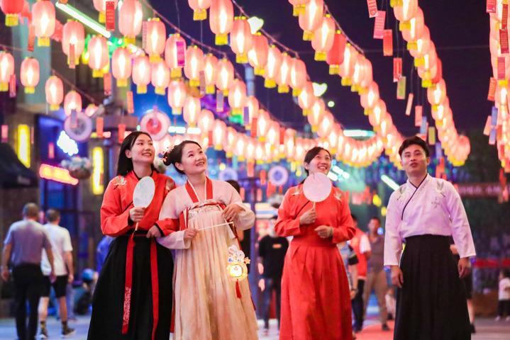 9月28日晚,湖州市長(zhǎng)興縣煤山鎮(zhèn)的村民和游客在賞花燈,逛廟會(huì)。新華社發(fā)(吳拯攝)