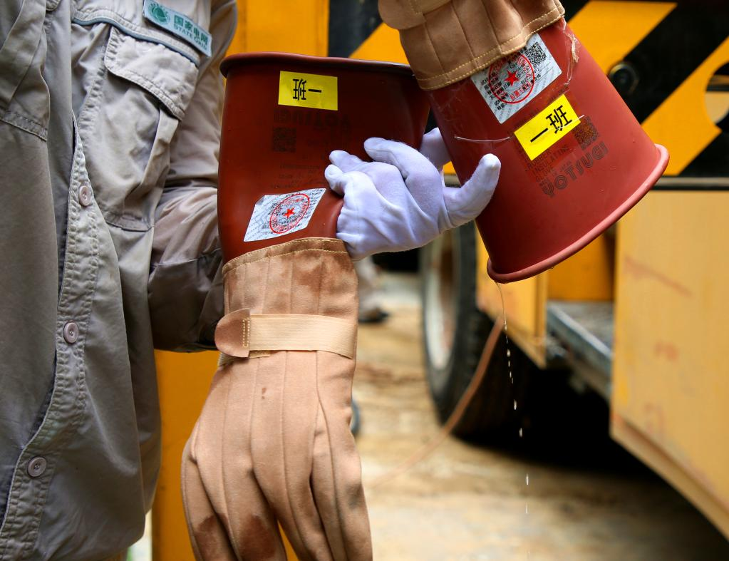 電力工人將絕緣手套里的汗水倒出。(圖片由受訪者提供)