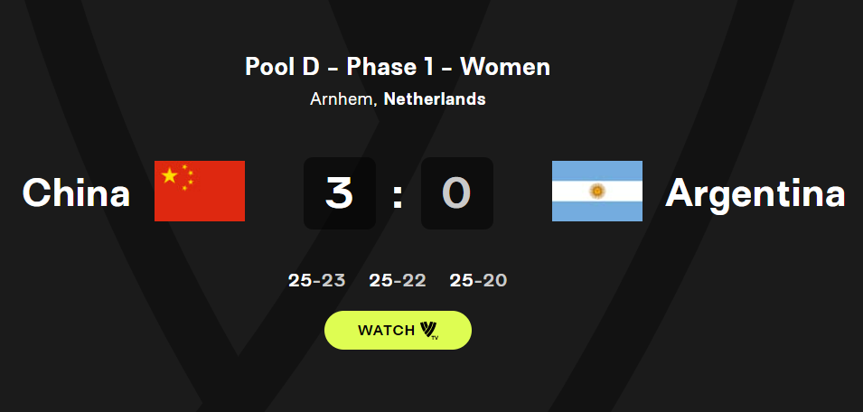 首局中國隊以25:23險勝。第二局開局中國隊始終保持領(lǐng)先,阿根廷隊隨后一度追至12平。李盈瑩一次扣殺、一次發(fā)球直接得分,加上對手連續(xù)兩次失誤,中國隊連得4分,將比分拉開。在以21:15領(lǐng)先時,中國隊被對手打出一波6:1的攻勢。此后,中國隊穩(wěn)住陣腳以25:22再下一城。