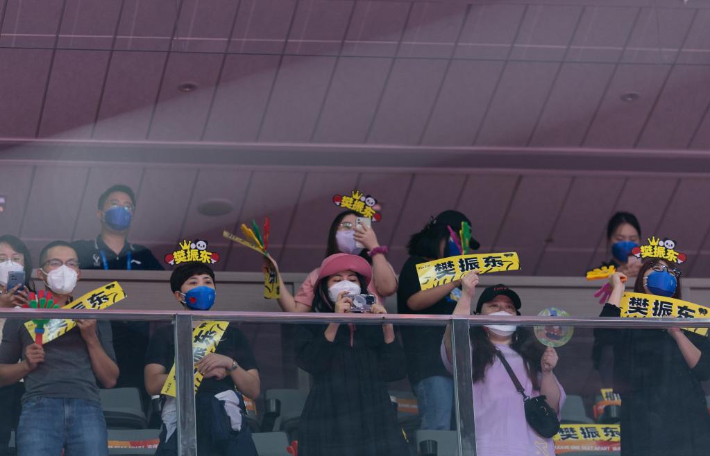 10月8日,現(xiàn)場觀眾為中國隊選手樊振東加油助威。新華社記者 江宏景 攝