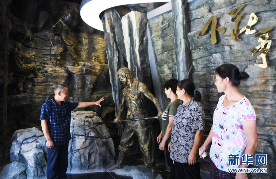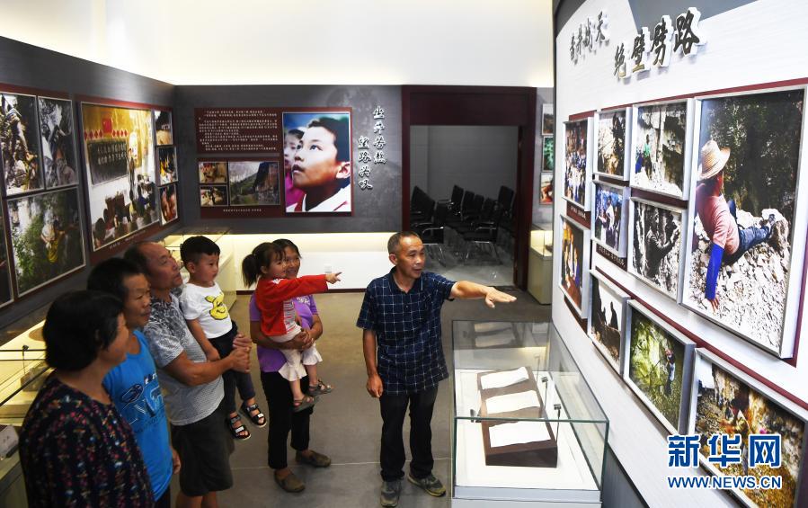 毛相林(右一)在下莊精神陳列館內(nèi)講述當(dāng)年修路的故事(2020年7月3日攝)。新華社記者 王全超 攝
