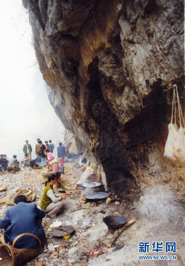 修路遠(yuǎn)比想象的難。四周陡峭巖壁,很難找到落腳之地,膽子大的腰系長繩站在籮筐里,吊在幾百米高的懸崖邊鉆炮眼,先炸出一小塊立足之地,再用鋤頭、鋼釬和大錘,一塊一塊把石頭鑿下來。