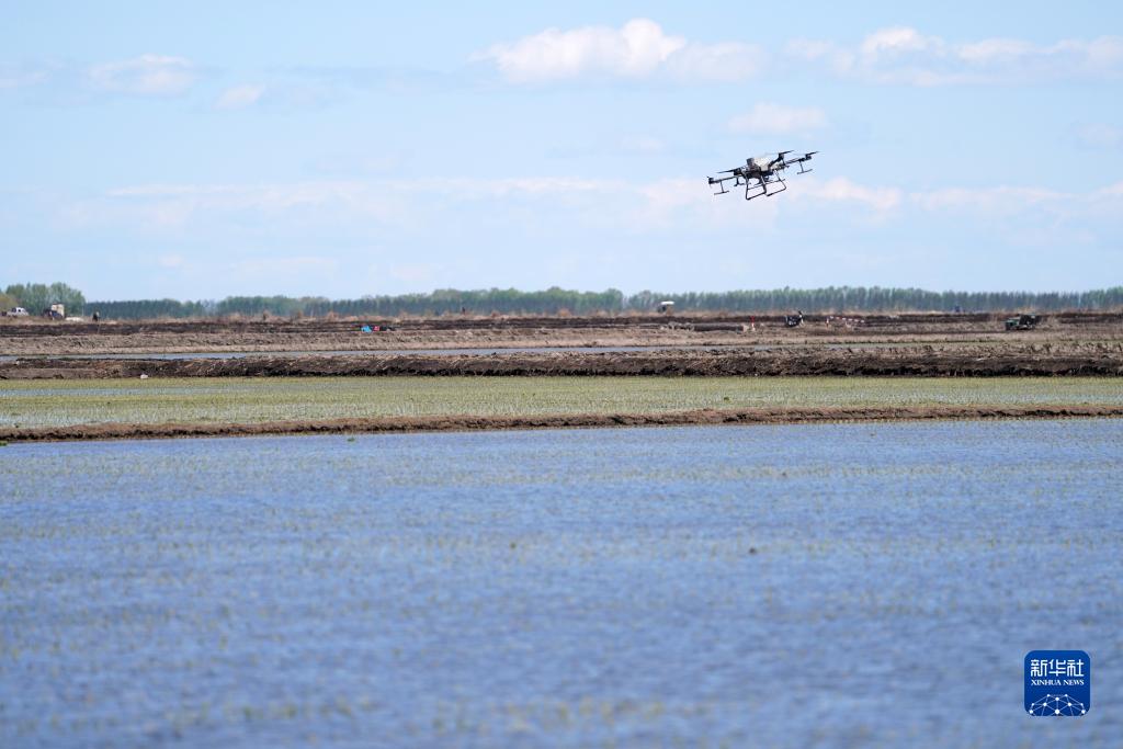 無人機(jī)在北大荒集團(tuán)七星農(nóng)場有限公司一塊稻田中作業(yè)(2022年5月18日攝)。 新華社記者 王建威 攝