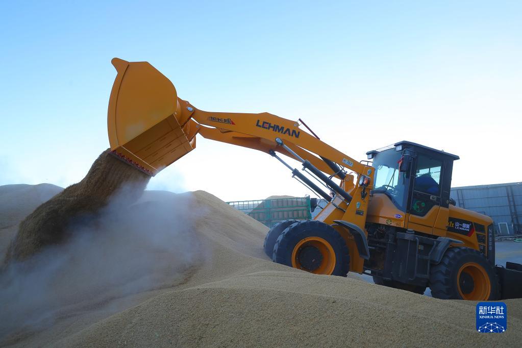 在沈陽遼北七星米業(yè)有限公司,工作人員駕駛鏟車對收購的水稻進(jìn)行攢堆(2022年10月18日攝)。 新華社記者 楊青 攝