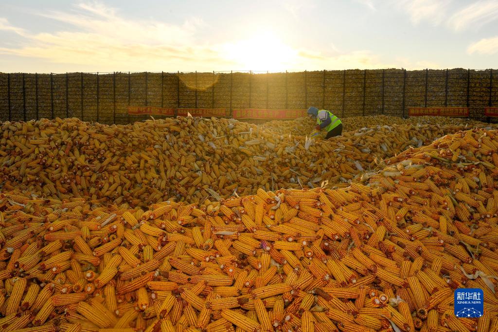 在北大荒集團(tuán)北安分公司趙光農(nóng)場有限公司,工作人員在一處曬場的玉米堆上忙碌(2022年10月19日攝)。 新華社記者 王建威 攝