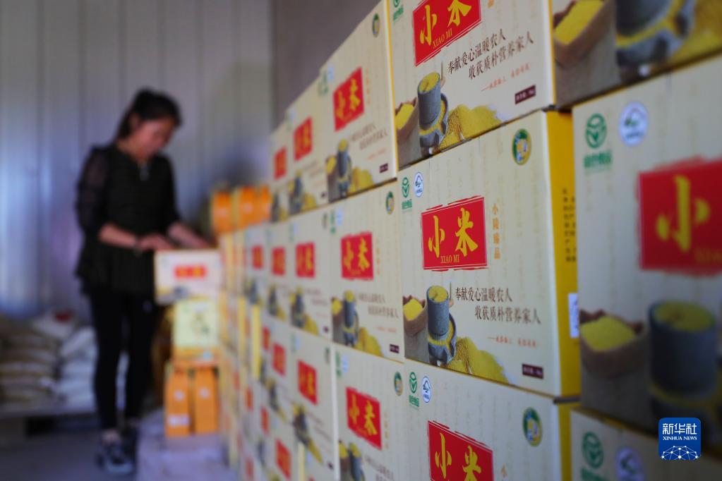 在沈陽市康平縣方家屯鎮(zhèn)東小陵村,農(nóng)民將封裝好的小米裝箱(2022年9月21日攝)。 新華社記者 楊青 攝