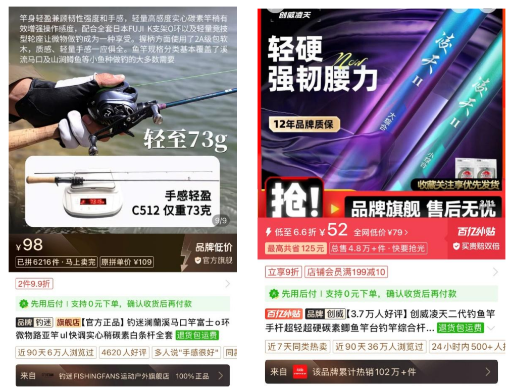 原材料的突破和量產(chǎn)使路亞竿的成本大幅下降。2023年,張榮波在拼多多推出了首款路亞竿,以重99克,100元左右的價(jià)格,“成了很多年輕人的第一支路亞竿”。