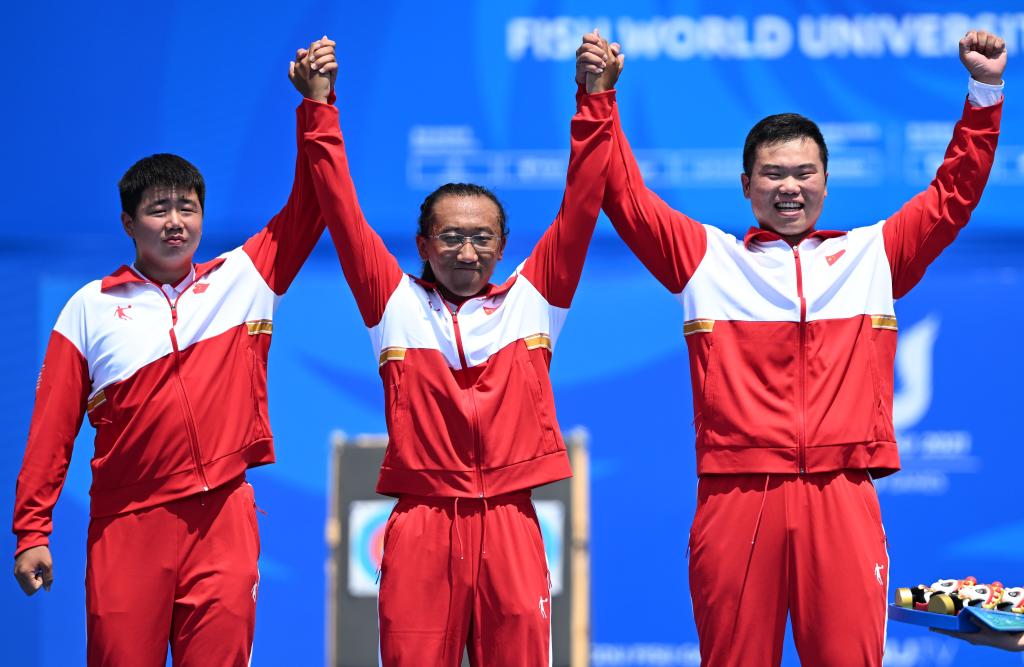 7月30日,中國(guó)隊(duì)選手陳巖松、杜美余、王世坤(從左至右)在頒獎(jiǎng)儀式上。當(dāng)日,在成都舉行的第31屆世界大學(xué)生夏季運(yùn)動(dòng)會(huì)男子復(fù)合弓團(tuán)體金牌賽中,中國(guó)隊(duì)以231環(huán):224環(huán)戰(zhàn)勝法國(guó)隊(duì),獲得冠軍。新華社記者張龍攝