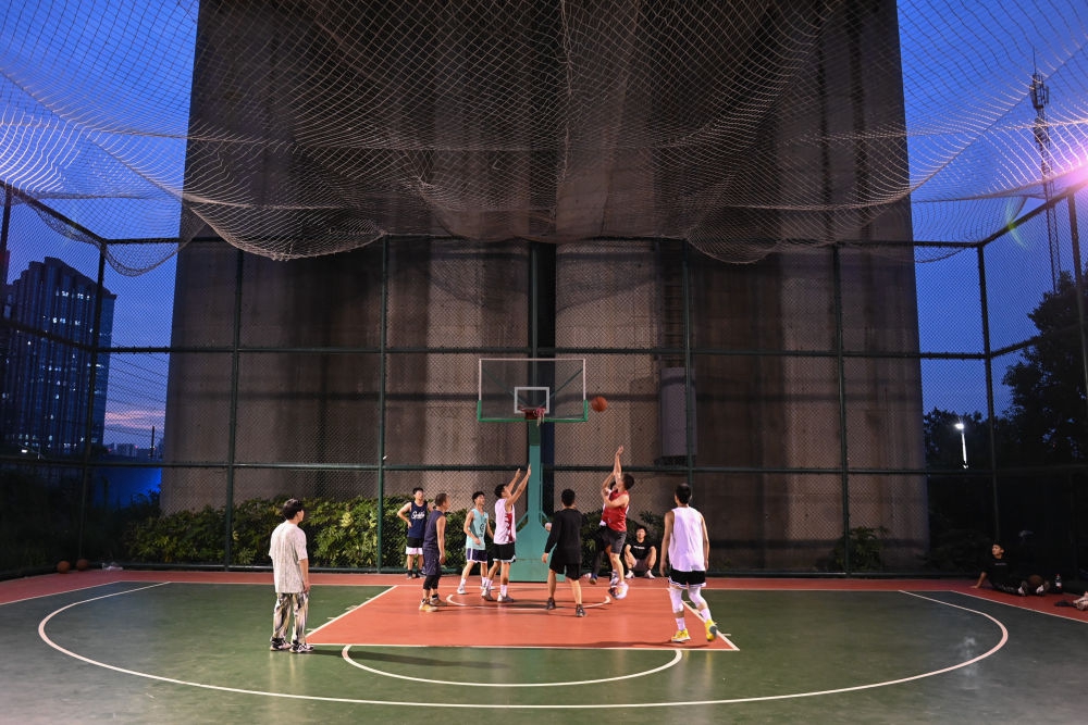 市民在位于高鐵橋下的浙江杭州錢江世紀城體育公園打籃球(2022年9月20日攝)。新華社記者 黃宗治 攝