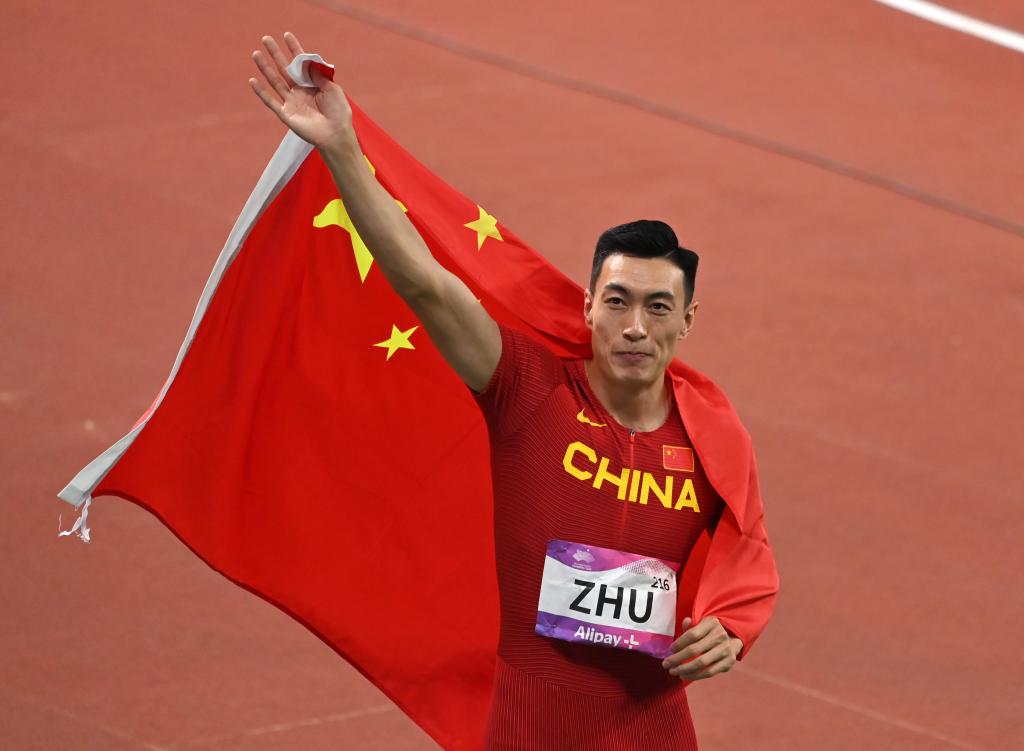 在男子三級(jí)跳遠(yuǎn)賽場,東京奧運(yùn)會(huì)亞軍、中國選手朱亞明在第三跳中跳出17米13的成績收獲冠軍。另一名中國選手方耀慶以16米93的成績獲得銀牌,銅牌被印度選手摘得。