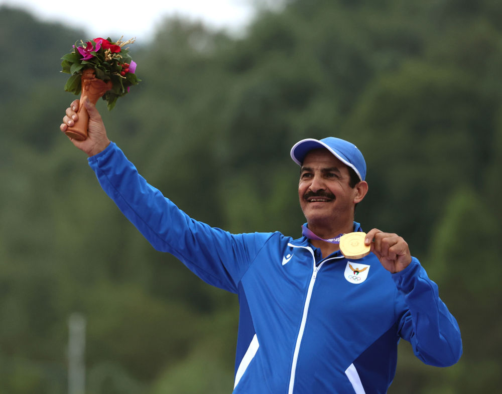 9月27日,金牌得主科威特選手阿卜杜拉·拉希迪在杭州亞運(yùn)會男子雙向飛碟個人賽頒獎儀式上。新華社記者 杜瀟逸 攝