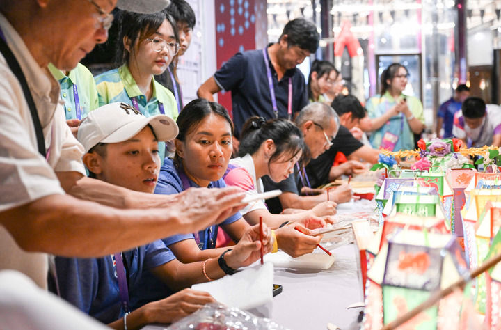 9月25日,在杭州亞運(yùn)會淳安賽區(qū),泰國運(yùn)動員(兩位紫色衣服者)在觀看淳安縣里商仁燈的制作過程。新華社記者 胡虎虎 攝