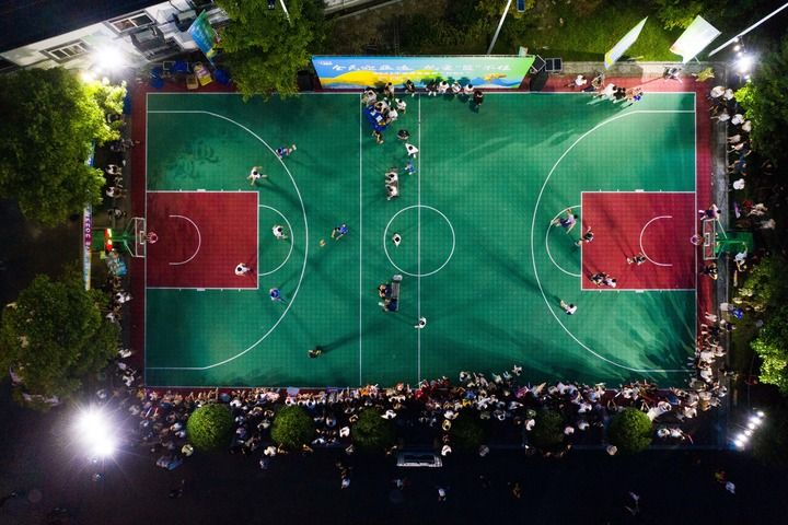 8月5日,在浙江省杭州市臨平區(qū)塘棲鎮(zhèn)三星村籃球場上,球員們在嘉年華比賽中拼搶(無人機(jī)照片)。新華社記者 徐昱 攝