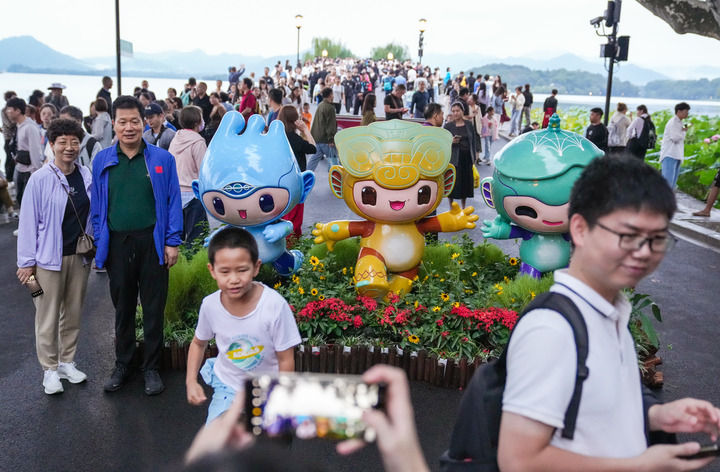 9月23日,游客在西湖邊與杭州亞運(yùn)會吉祥物合影。新華社記者 韓傳號 攝