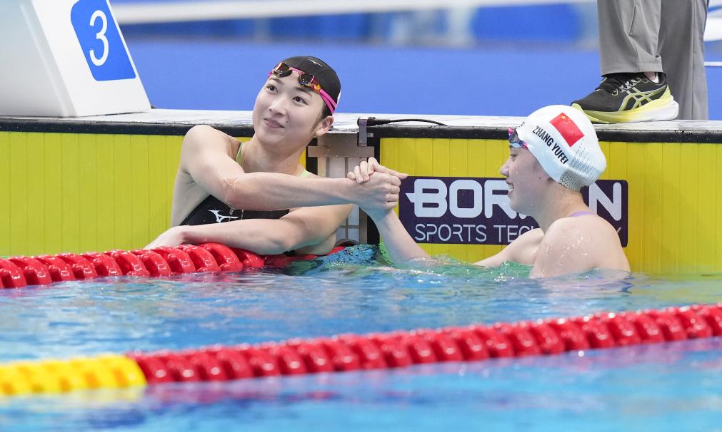 9月29日,中國選手張雨霏(右)與日本選手池江璃花子在女子50米蝶泳決賽后相互致意。新華社記者 杜宇 攝