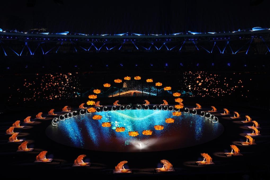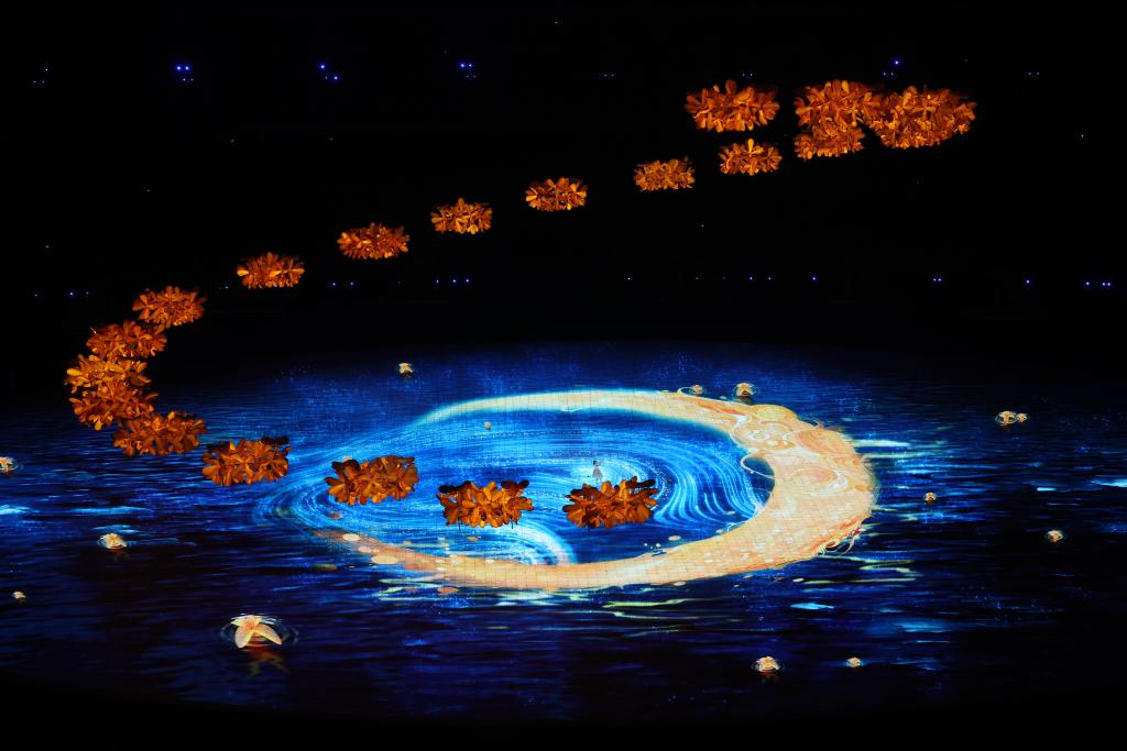 網(wǎng)幕的影像與地面影像形成多維空間的雙橋合抱,匯聚成圓,祝福每一個有夢、追夢的人,夢想圓滿,寄寓亞洲山水相連、團(tuán)結(jié)圓融。22組金桂花團(tuán)不斷變化,在空中形成巨大的“金桂花冠”,花冠投射的光芒溫暖女孩的追夢之旅,也向每一位運(yùn)動員傳遞“逐夢折桂、舍我其誰”的美好寓意。