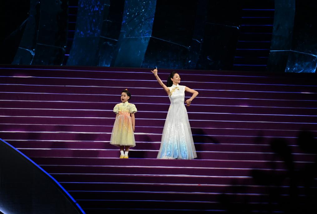 “一條大河波浪寬,風(fēng)吹稻花香兩岸……”兩名聽障兒童佩戴人工耳蝸與健全兒童一同深情唱響《我的祖國》。在童聲合唱中,數(shù)十名聽障兒童護(hù)送國旗走入會場。