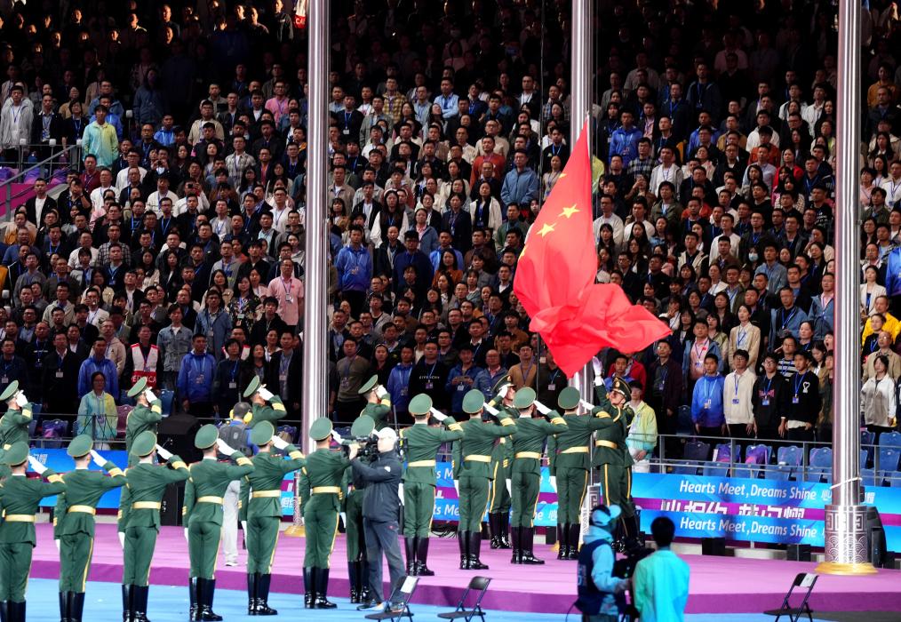 10月22日,中華人民共和國國旗在杭州第4屆亞洲殘疾人運(yùn)動會開幕式上升起。新華社記者韓傳號攝