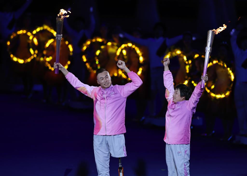 10月22日,火炬手鄭雄鷹(右)、侯斌在開幕式上傳遞火炬。新華社記者賈浩成攝