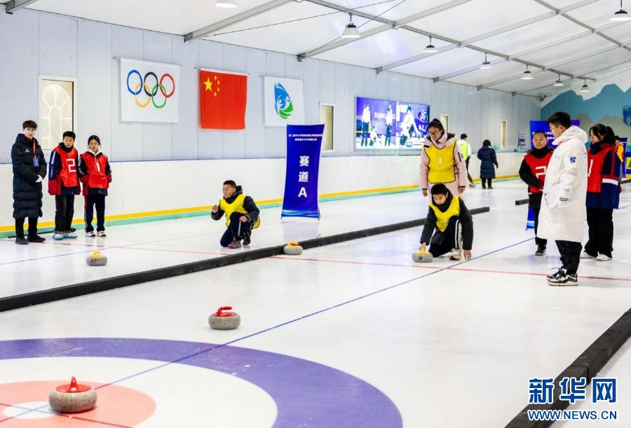 2023年12月10日,小學生在在呼和浩特首屆中小學冰壺比賽中投擲冰壺。新華網(wǎng)發(fā)(丁根厚 攝)