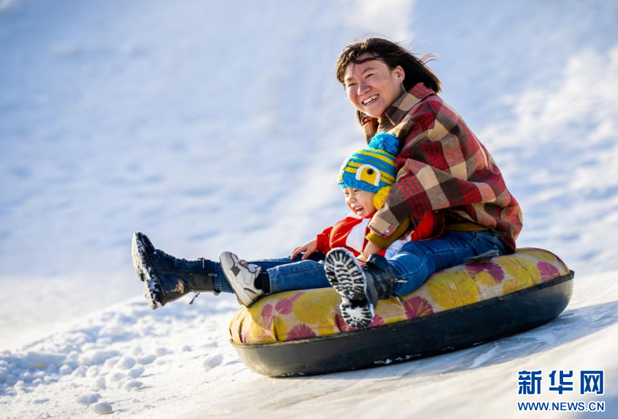 1月10日,家長陪伴孩子在呼和浩特市玉泉區(qū)大庫倫村“冰雪大世界”內(nèi)玩雪圈。新華網(wǎng)發(fā)(丁根厚 攝)