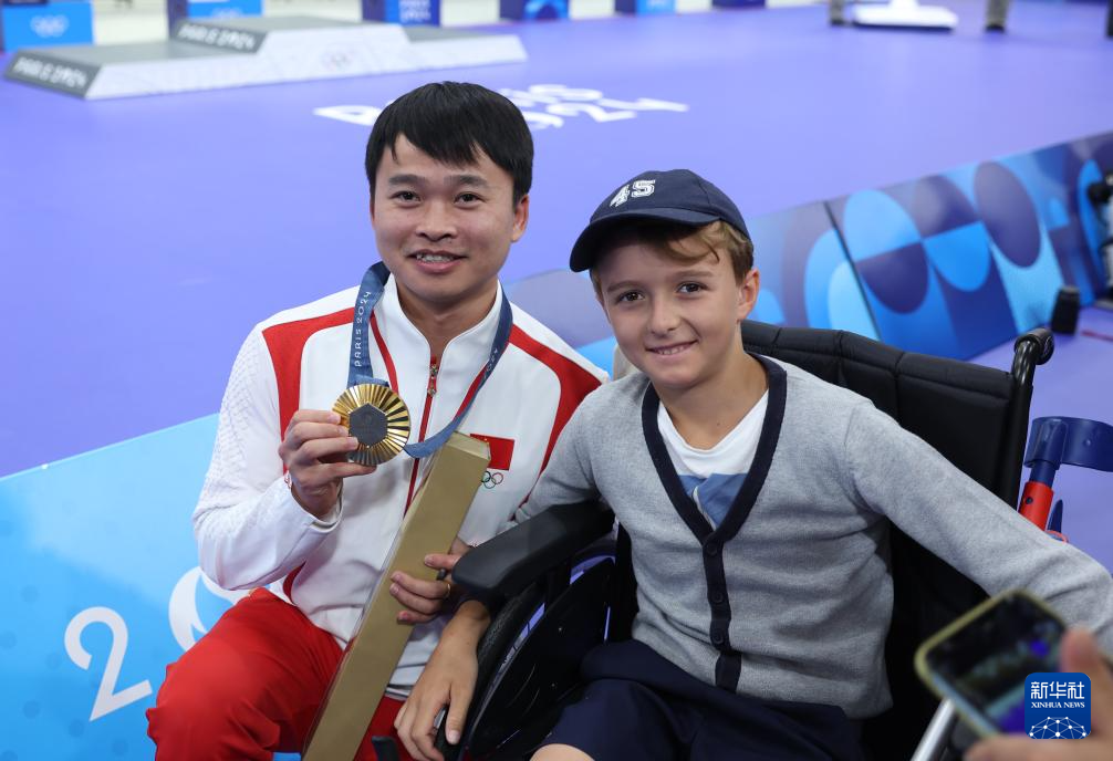7月28日,謝瑜(左)在頒獎(jiǎng)儀式后和一名觀眾合影。新華社記者 趙丁喆 攝