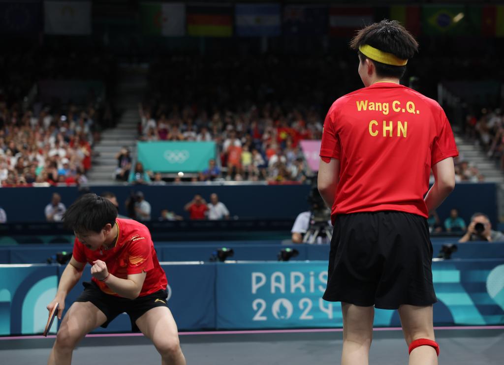 7月30日,王楚欽(右)/孫穎莎慶祝奪冠。新華社記者 王東震 攝