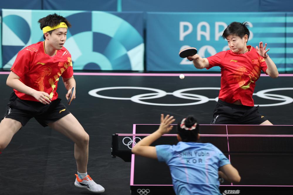7月29日,王楚欽/孫穎莎在比賽中。當(dāng)日,在巴黎奧運(yùn)會(huì)乒乓球混雙半決賽中,中國(guó)組合王楚欽/孫穎莎4比2戰(zhàn)勝韓國(guó)組合林仲勛/申裕斌,晉級(jí)決賽。新華社記者 劉續(xù) 攝
