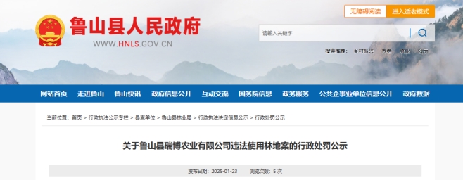 2025年1月23日魯山縣人民政府網(wǎng)站發(fā)布處罰公示,關(guān)于魯山縣瑞博農(nóng)業(yè)有限公司(魯山縣瓦屋鎮(zhèn)土橋村大河溝組118號)因違法使用林地,責(zé)令自接到林業(yè)行政處罰決定書之日起三個月內(nèi)恢復(fù)植被和林業(yè)生產(chǎn)條件,處恢復(fù)植被和林業(yè)生產(chǎn)種植條件所需費用8814.3元0.8倍的罰款,計人民幣柒仟零伍拾壹元肆角肆分(7051.44元)