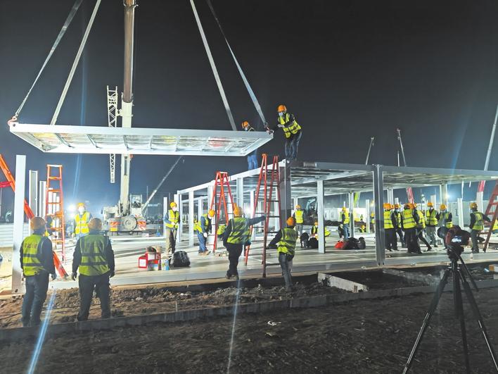 施工現(xiàn)場機械轟鳴、吊臂起落,援建人員與疫情競賽、和時間賽跑。16小時后,120間隔離房主體框架的搭建工作全部完成。