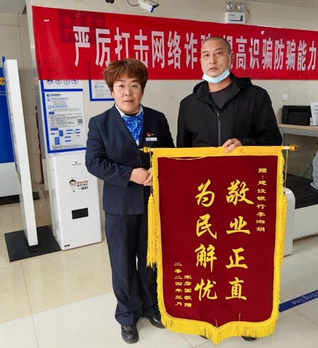為了表達(dá)感激之情,宋先生特意為該支行行長送來了一面錦旗,上面寫著“敬業(yè)正直 為民解憂”八個(gè)大字,對(duì)該支行的這次專業(yè)周到的服務(wù)表示了高度認(rèn)可。