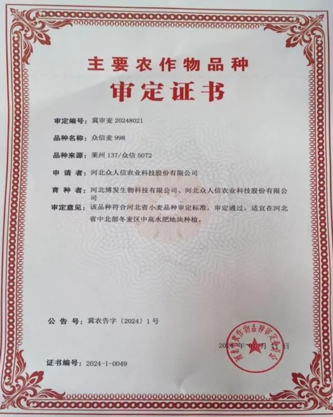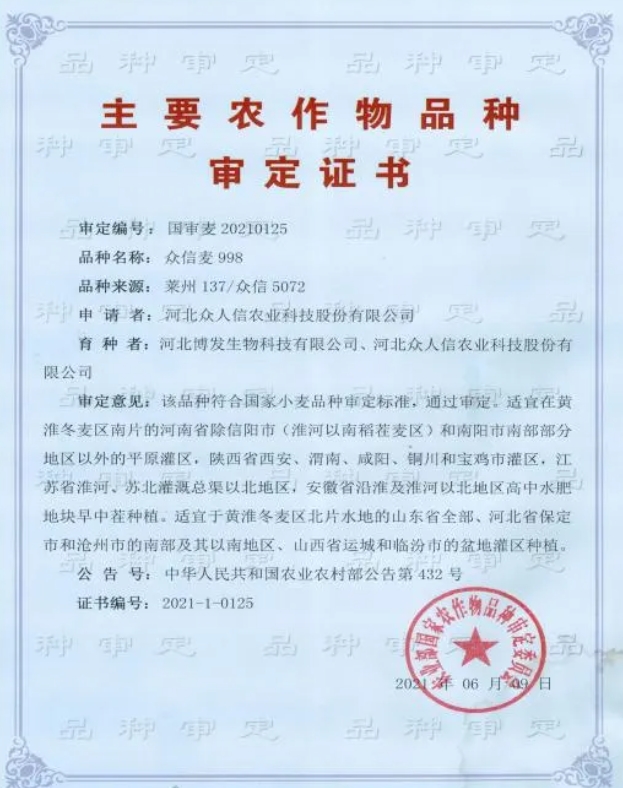 邯鄲市育種企業(yè)河北博發(fā)生物科技有限公司和河北眾人信農業(yè)科技有限責任公司強強聯(lián)合,始終堅持“扎根種業(yè)、心系三農”,始終堅持“自主創(chuàng)新、勇攀高峰”,聯(lián)合培育成功的矮稈多抗、穗大粒多、廣適超高產小麥新品種“眾信麥998”,2021年同時通過國家黃淮冬麥區(qū)北片水地組和南片水地組“雙國審”,可以在河北、山東、山西、陜西、河南、江蘇、安徽等7個省推廣。