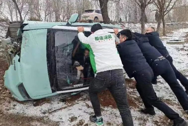 接警后,指揮中心立即指派劉營派出所趕赴現(xiàn)場處置,經(jīng)了解,駕駛員途經(jīng)此路段時,由于路面溜滑,操作不慎,導(dǎo)致車輛側(cè)翻至路邊溝內(nèi),車頭損壞嚴(yán)重,車門也無法打開,駕駛員被困在車?yán)铮胰藛T沒有受傷。