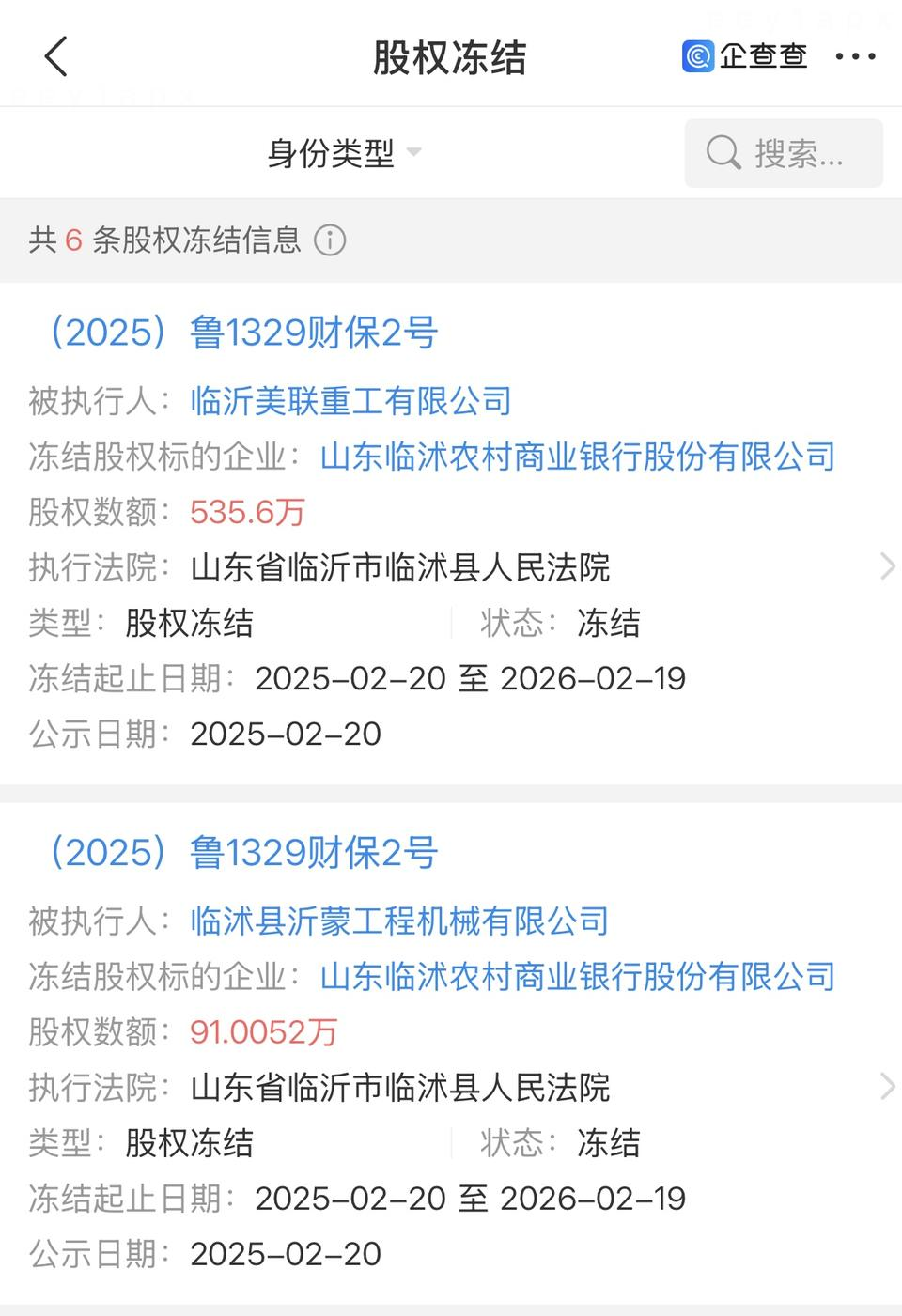 新近被凍結(jié)股權(quán)的持有人分別為臨沂美聯(lián)重工有限公司與臨沭縣沂蒙工程機(jī)械有限公司(簡(jiǎn)稱“沂蒙機(jī)械”),二者對(duì)臨沭農(nóng)商行持股比例為0.88%、0.15%,對(duì)應(yīng)凍結(jié)股權(quán)數(shù)額為535.6萬(wàn)、91.01萬(wàn),二者涉同一財(cái)產(chǎn)保全案件。