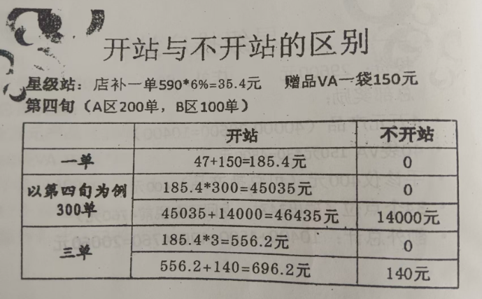 “如果不開站,就是在給站長打工,”只有成為站長,才能掙到160元的差價,否則“150元的貨物也拿不到,差價賺不到,店補(bǔ)賺不到,贈送的貨也拿不到。”