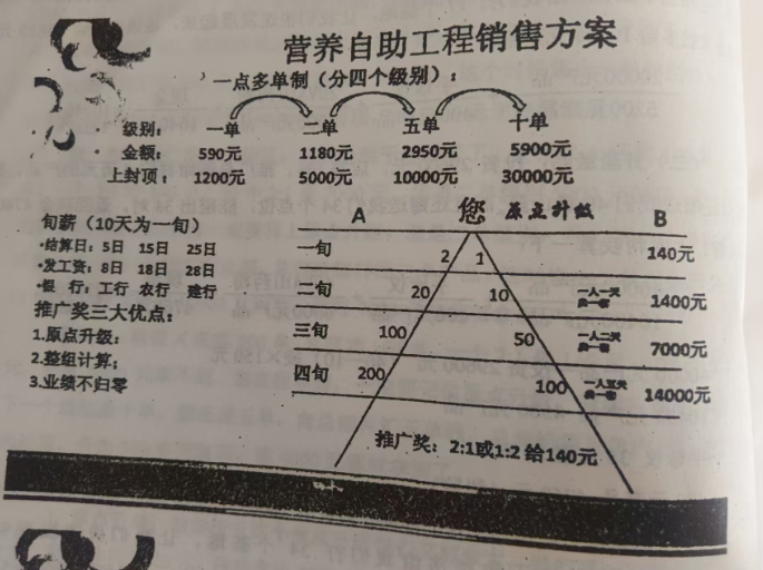 根據(jù)江彤的講述及其推薦的銷售體系講解視頻,記者了解到,消費(fèi)者加入銷售的方式共有兩種,即成為“站點(diǎn)”或者“站長”。每個“站點(diǎn)”可將自己的“下線”劃分為AB兩個區(qū),在個人所處的點(diǎn)位往下,按照AB區(qū)開單數(shù)量進(jìn)行比對,有多少個2:1或者1:2,“公司就給多少個140元。”換句話說,每賣出三單,能獲得140元獎勵。如果介紹的人夠多,還可以形成大區(qū),獲利更多,“這才是大錢。比如我這一天賣出去10單1:2或者2:1,這一天我就收獲1400元。”視頻中,一位工作人員進(jìn)一步舉例,“假設(shè)在你的點(diǎn)位之下,你介紹甲吃(買)了590元,又介紹乙吃了590元,也可以介紹丙也吃了590元,又或者丙是甲或乙介紹的,這都無所謂,只要在你點(diǎn)位往下,不管是張三干(賣)的,還是李四王五干的,與你全有業(yè)績關(guān)系。(可以)將甲乙放在A區(qū),丙在B區(qū),兩個區(qū)2:1,就形成(賺)了140元。”