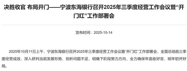 近日,寧波東海銀行吹響“開門紅”號角。10月14日,寧波東海銀行發(fā)布公告稱,該行于10月11日召開2025年三季度經營工作會議暨“開門紅”工作部署會。