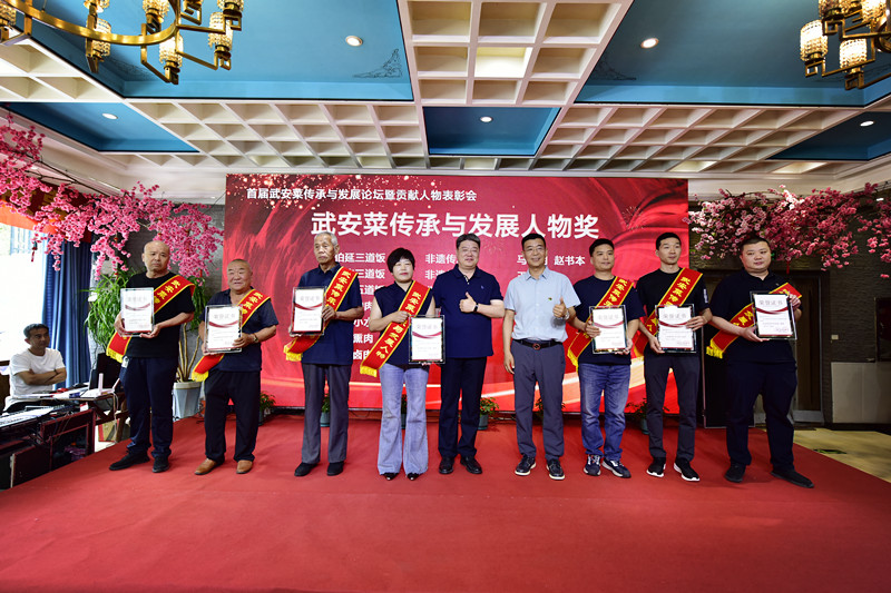 活動現(xiàn)場隆重舉行“武安菜傳承與發(fā)展人物獎”、“武安菜傳承與發(fā)展突出貢獻(xiàn)獎”頒獎儀式。這次表彰的杰出人物,多是餐飲業(yè)相關(guān)有影響力的人武安非物質(zhì)文化遺產(chǎn)傳承人、武安地域食材行業(yè)人物、武安文旅行業(yè)代表、武安文化的專家學(xué)者等長期以來在武安菜發(fā)展過程中做出過歷史貢獻(xiàn)的行業(yè)代表。這些獲獎?wù)邚牟煌S度詮釋著武安菜的精髓:守護(hù)者、奠基者、推廣者、記錄者,彰顯了文化與美食交融的力量。