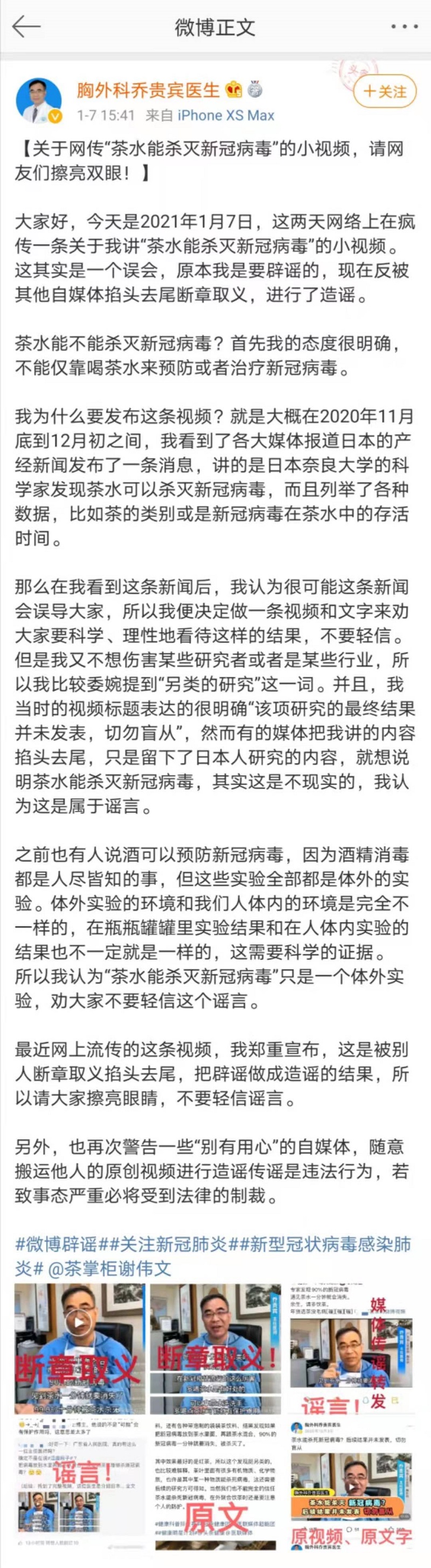 而在今年1月7日,喬貴賓就已經(jīng)發(fā)布微博,針對(duì)此視頻表示“有的媒體把我講的內(nèi)容掐頭去尾,只是留下了日本人研究的內(nèi)容,就想說明茶水能殺滅新冠病毒,其實(shí)這是不現(xiàn)實(shí)的,我認(rèn)為這是屬于謠言。”
