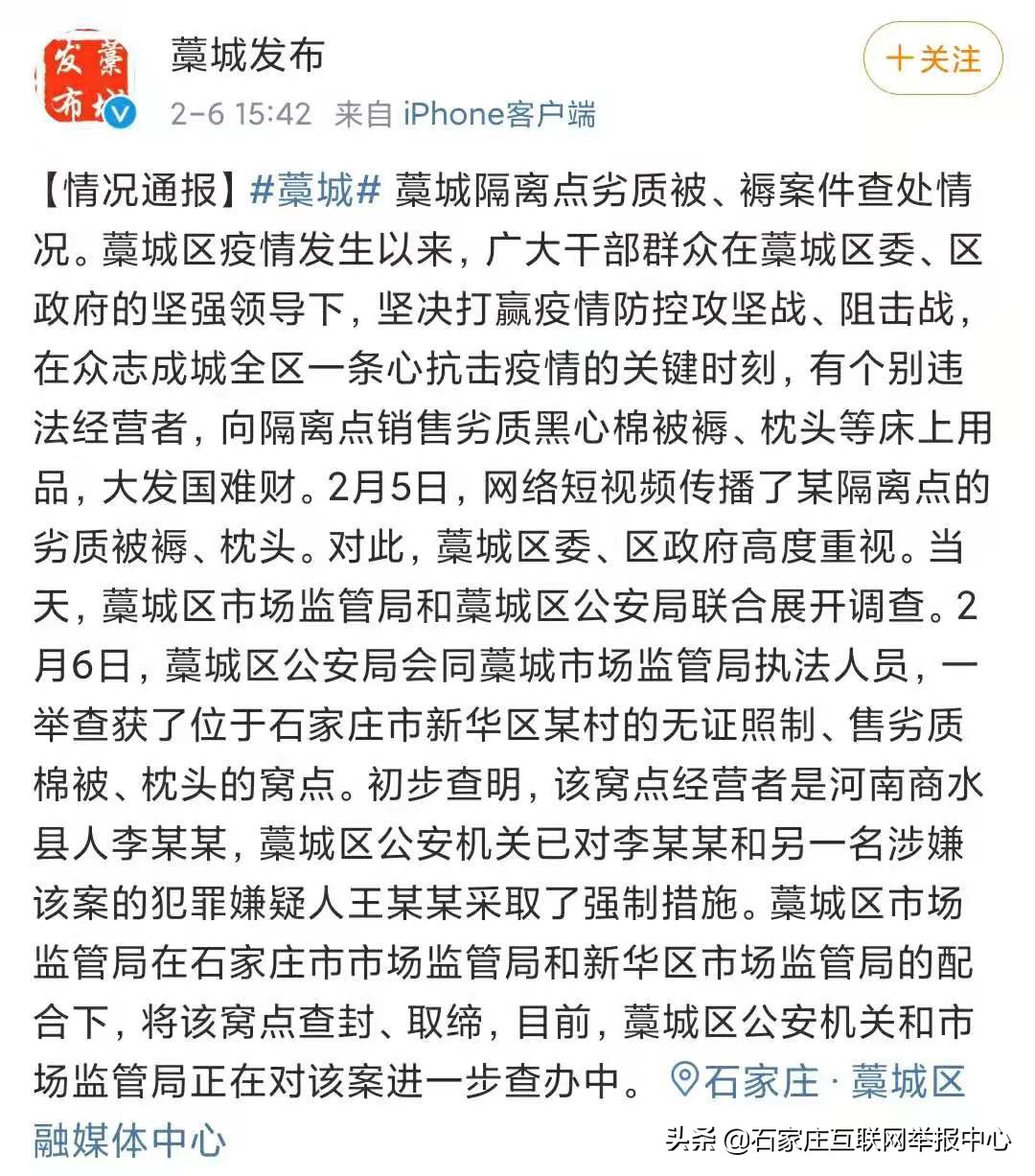 近日,網(wǎng)絡(luò)流傳一則視頻反映石家莊藁城區(qū)某隔離點(diǎn)給志愿者和隔離人員發(fā)放劣質(zhì)被褥。6日下午,藁城區(qū)發(fā)布調(diào)查情況,有個(gè)別違法經(jīng)營(yíng)者向隔離點(diǎn)銷售劣質(zhì)黑心棉被褥、枕頭等床上用品,大發(fā)國(guó)難財(cái),市場(chǎng)監(jiān)管部門和公安部門聯(lián)合展開調(diào)查,于2月6日查獲了位于石家莊新華區(qū)某村的無(wú)證照制、售劣質(zhì)棉被、枕頭的窩點(diǎn)。公安機(jī)關(guān)已對(duì)該窩點(diǎn)經(jīng)營(yíng)者李某某和另一名涉嫌該案的犯罪嫌疑人王某某采取了強(qiáng)制措施,市場(chǎng)監(jiān)管部門將該窩點(diǎn)查封、取締,目前,公安機(jī)關(guān)和市場(chǎng)監(jiān)管部門正在對(duì)該案進(jìn)一步查辦中。