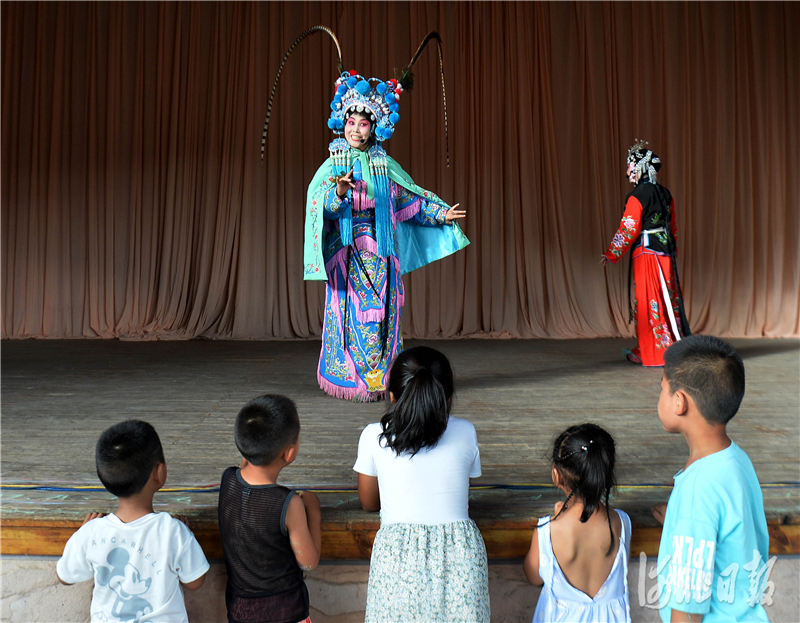 2020年8月18日,樓上村喜歡平調落子的小朋友在村戲臺前聽戲。河北日報記者 張昊 攝影報道