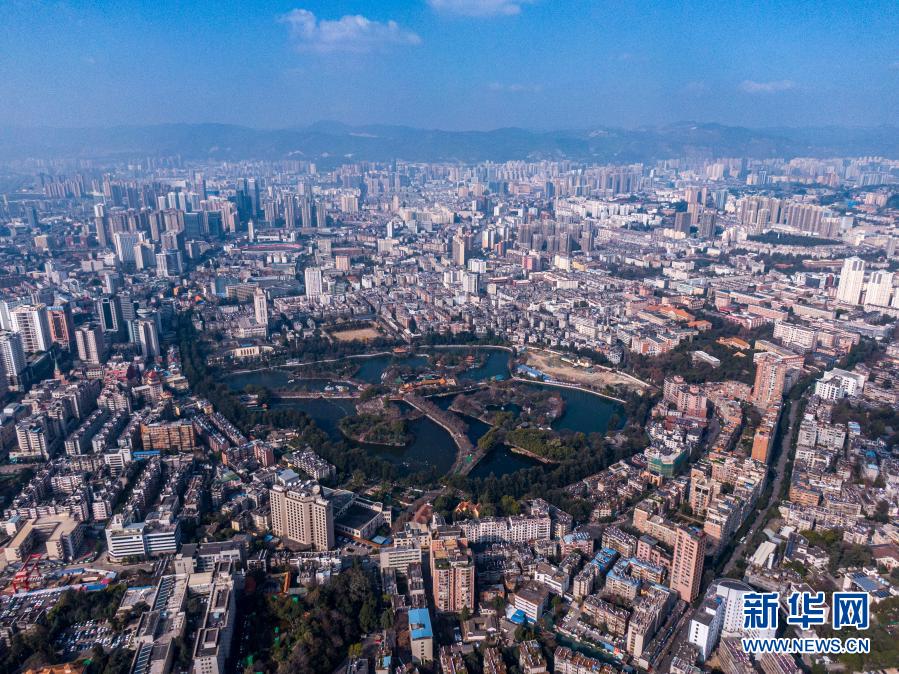 從中共云南地下黨建黨舊址上空俯瞰昆明城區(qū)(無人機照片,1月22日攝)。新華社記者 江文耀 攝