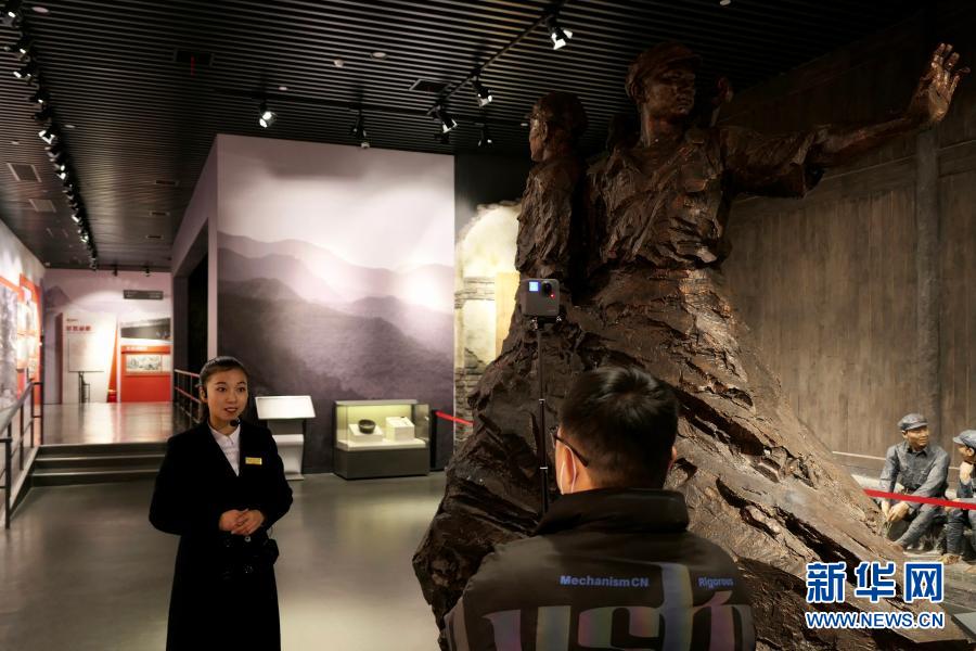 1月26日,在中國工農(nóng)紅軍第二方面軍長征出發(fā)地紀(jì)念館,講解員(左)在介紹一尊雕像,雕像中的三位紅軍都是獨(dú)臂,紅二方面軍出了三位“獨(dú)臂開國將軍”——賀炳炎、余秋里、晏福生。新華社記者 蘇曉洲 攝