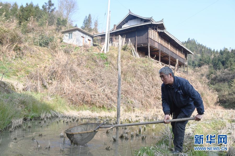 58歲的兵書閣村農(nóng)民吳澤文在自家屋門前撈禾花魚(1月28日攝)。新華社記者 周勉 攝