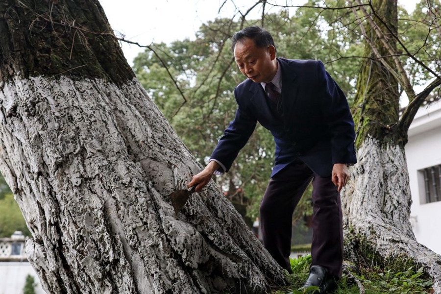 1月27日,67歲的“樹醫(yī)生”張本光在養(yǎng)護(hù)遵義會(huì)議會(huì)址前的槐樹。(新華社記者歐東衢 攝)