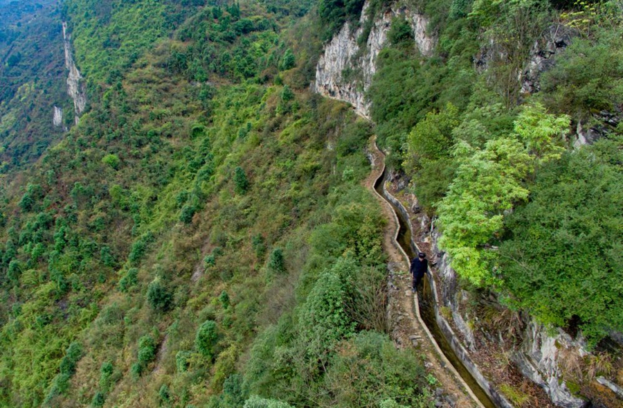 距離遵義會(huì)議會(huì)址100公里的播州區(qū)平正仡佬族鄉(xiāng)團(tuán)結(jié)村,共產(chǎn)黨員黃大發(fā)自20世紀(jì)60年代起,帶領(lǐng)200多名群眾,歷時(shí)30余年,靠著鋤頭、鋼釬、鐵錘和雙手,硬生生在絕壁上鑿出一條長9400米、地跨3個(gè)村的“生命渠”,結(jié)束了當(dāng)?shù)亻L期缺水的歷史,被稱為“大山里的愚公”。
