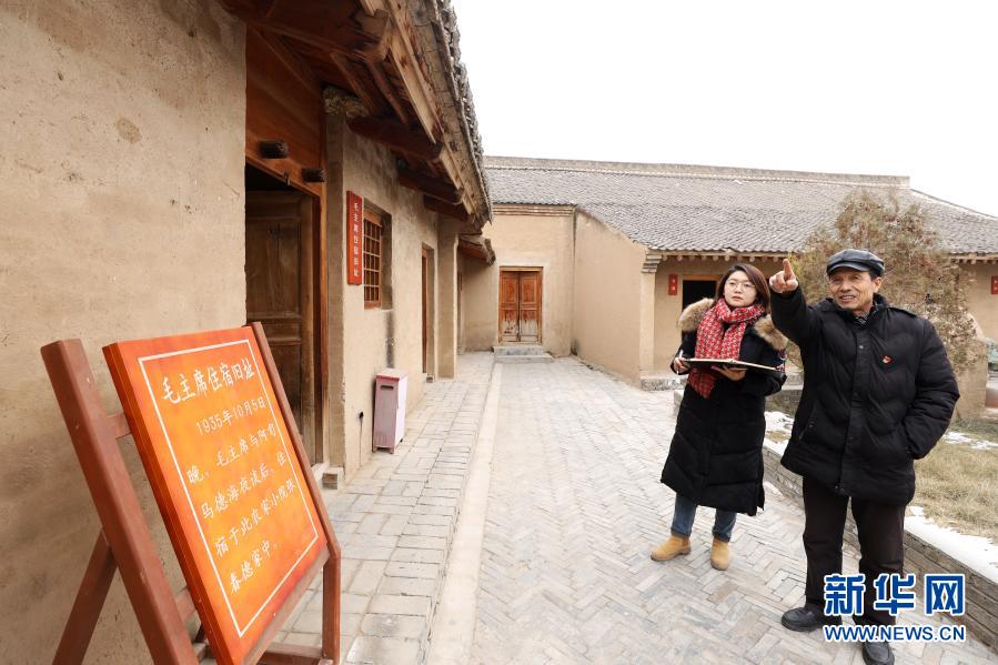 單家集單南村黨支部書記單云(右)介紹毛主席帶領(lǐng)中央紅軍途經(jīng)單家集的歷史(1月29日攝)。新華社記者 盧鷹 攝