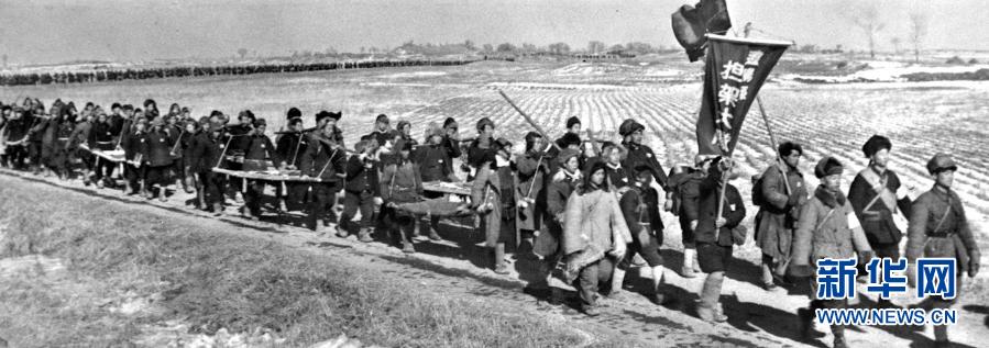 在遼沈戰(zhàn)役中,當(dāng)?shù)匕傩战M成擔(dān)架隊(duì),積極支援人民解放軍(資料照片)。新華社發(fā)