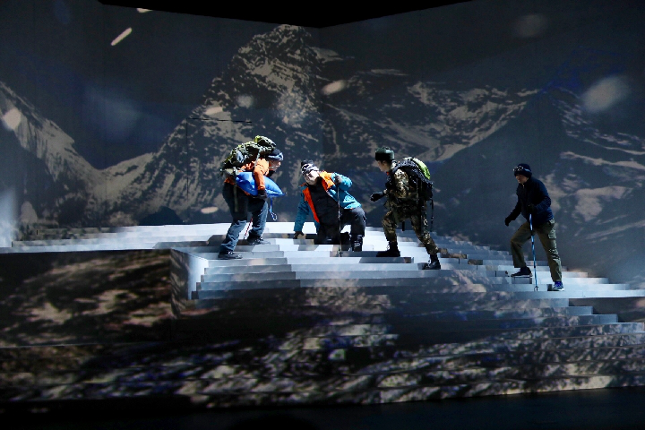 舞臺上,話劇《種子天堂》劇情進入最高潮——在缺氧、強風(fēng)惡劣環(huán)境下,鐘揚拼盡氣力來到海拔6000米的高度。當(dāng)他終于在一堆雜草和冰雪中發(fā)現(xiàn)那株頑強的雪蓮時,就像父親看到自己剛出生的嬰兒,臉上掛著深深的喜悅,凝望良久……